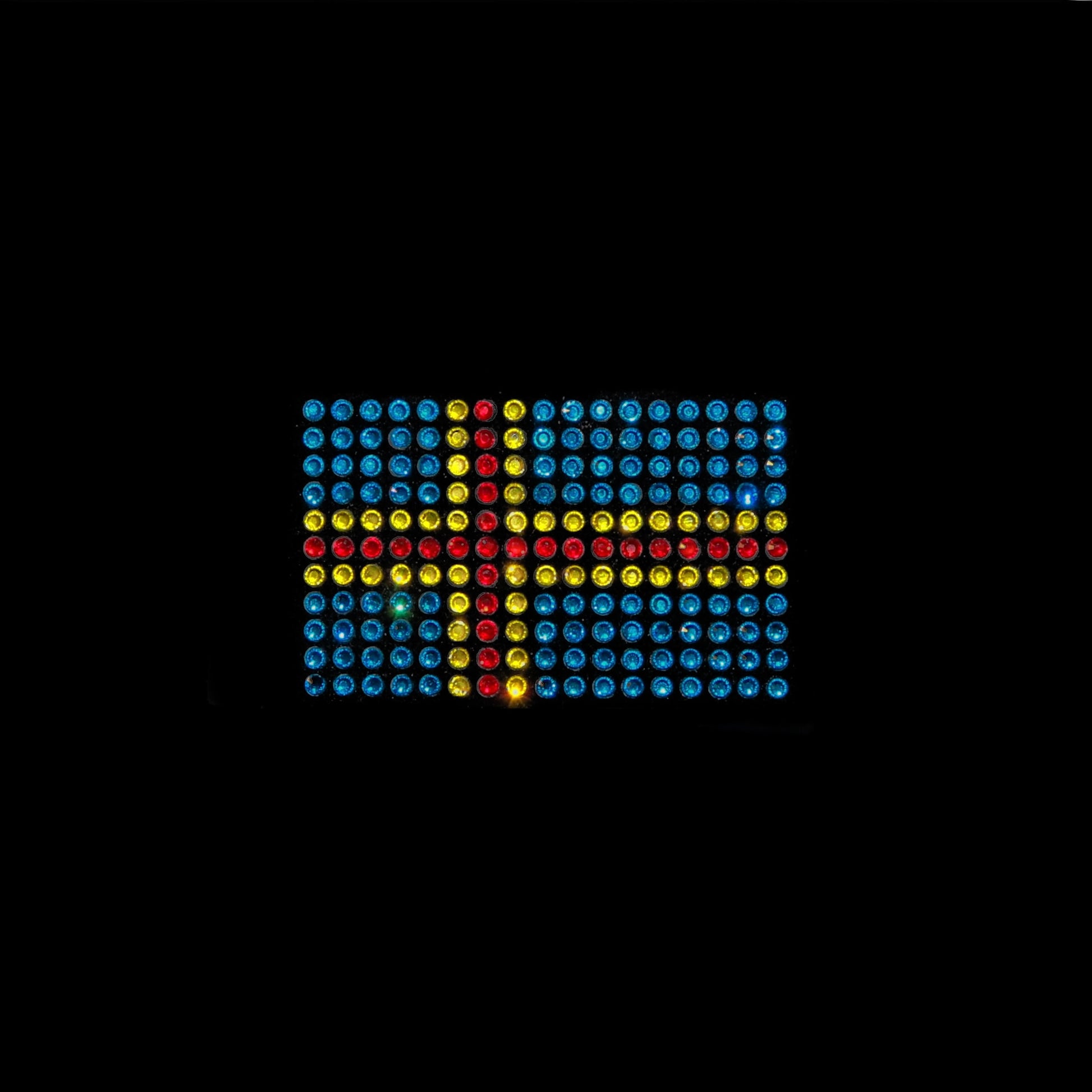 Designen är 7 cm bred och 4 cm hög och trycks med rhinestones i färgerna havsblå, ljusröd och gul.