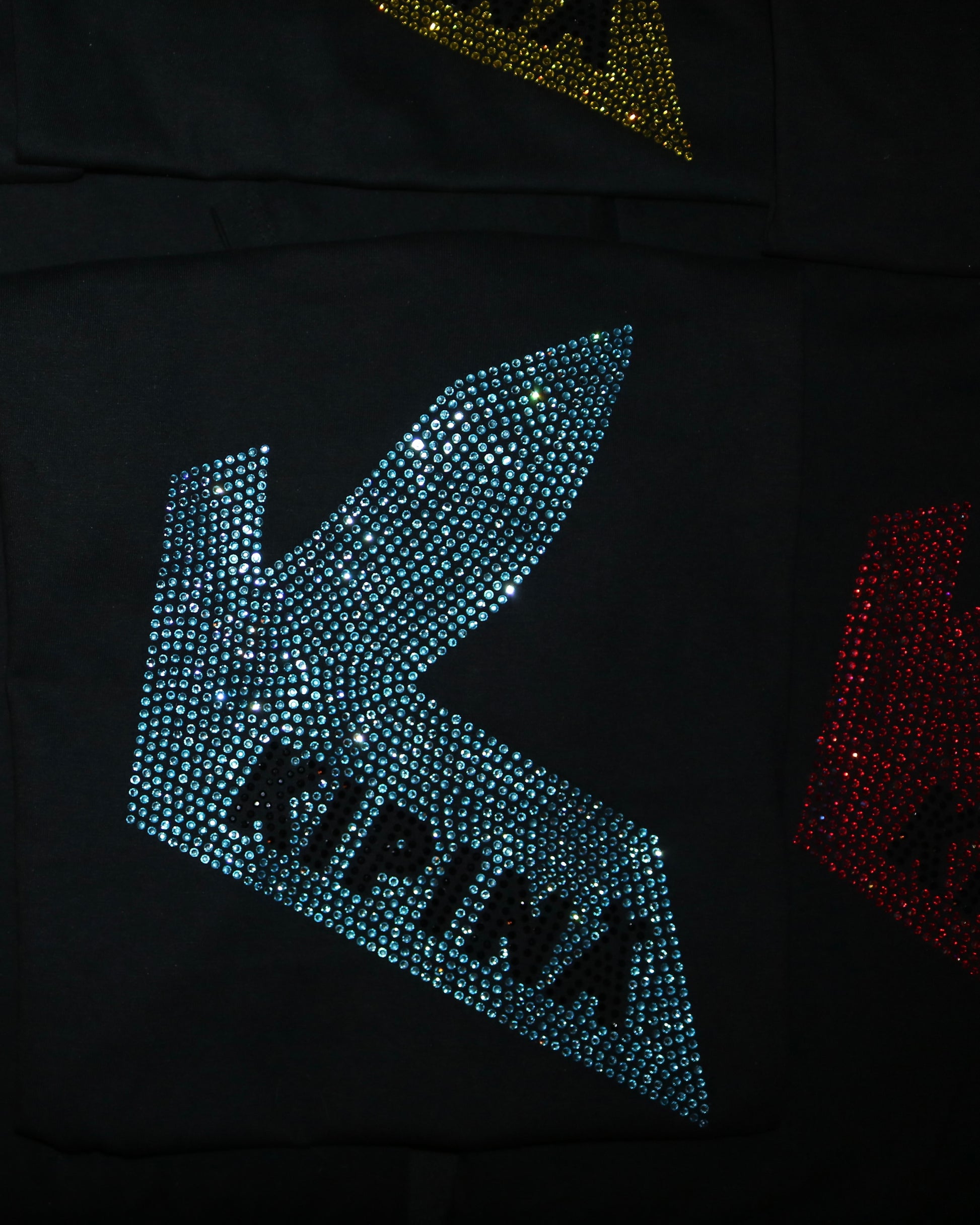 Glittrande rhinestone designs i den färg du väljer! Texten "KIPINÄ" trycks i svart färg.
