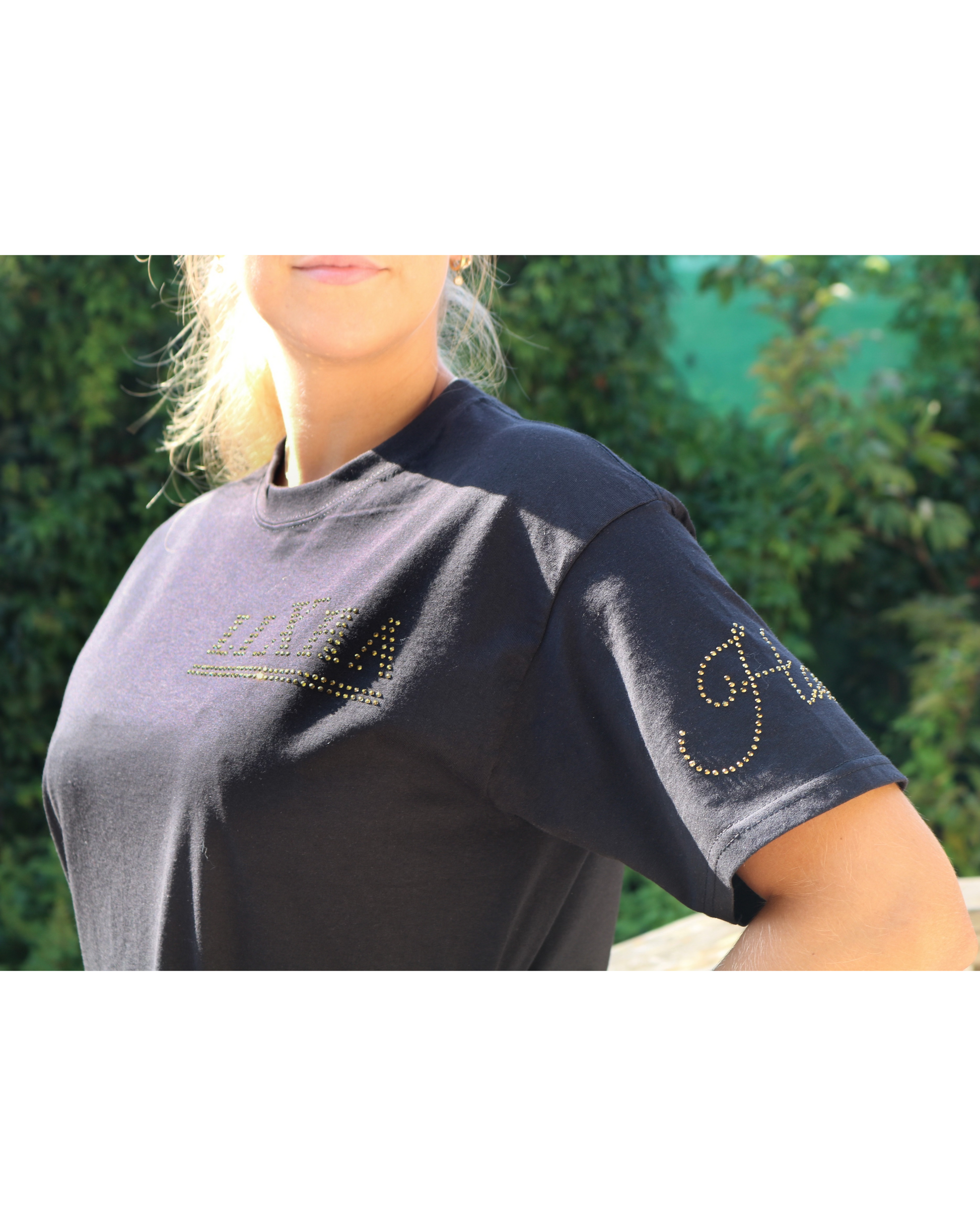 Unisex t-shirt i Belcoro® bomull med glittrande guldfärgade (Topaz) rhinestone designs!